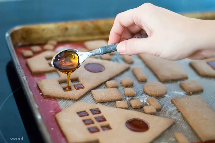 I used Martha's recipe for sugar syrup for my gingerbread house. You can find it here. With a steady hand use a small spoon to pour the caramel into the window cutouts. Using the caramel for glue allows for a more secure house with almost instant results unlike royal icing that can take hours to dry. If your caramel begins to harden before you are done with construction put the sauce pan back over low heat but do not let boil or you run the risk of burning your caramel. Which doesn't taste or look good.