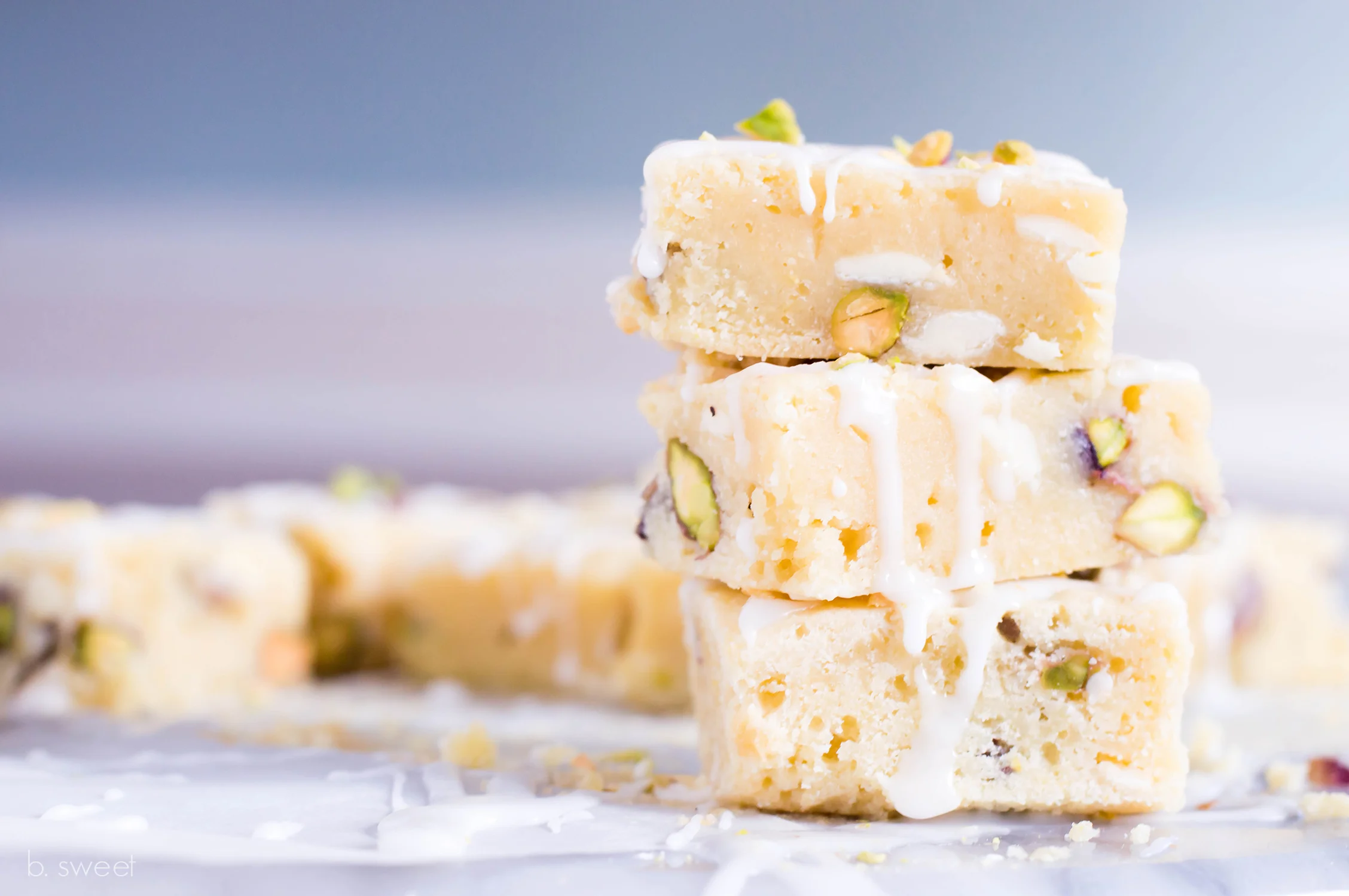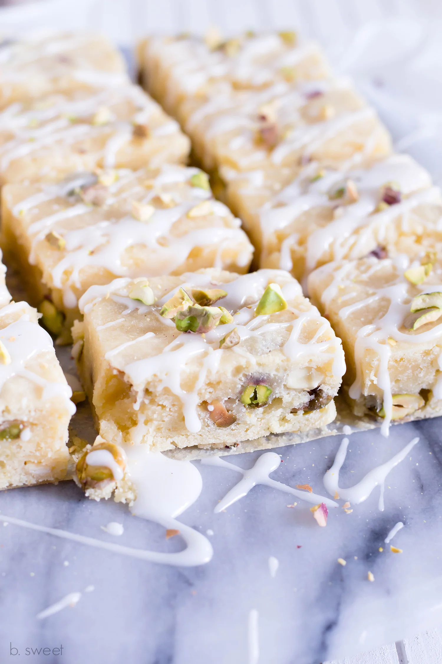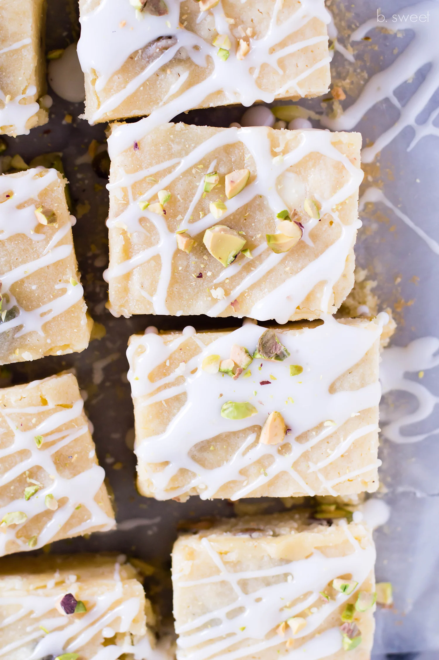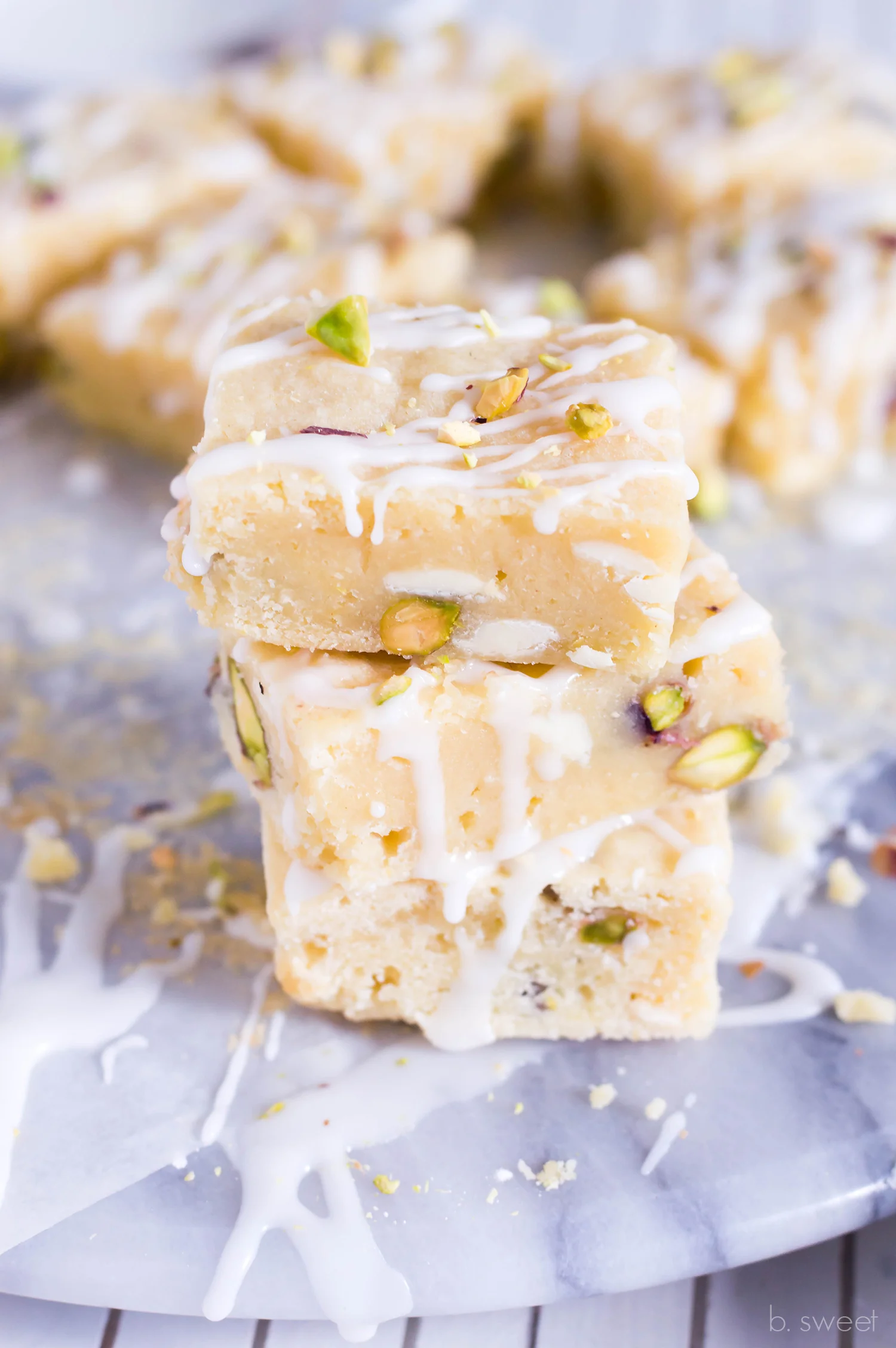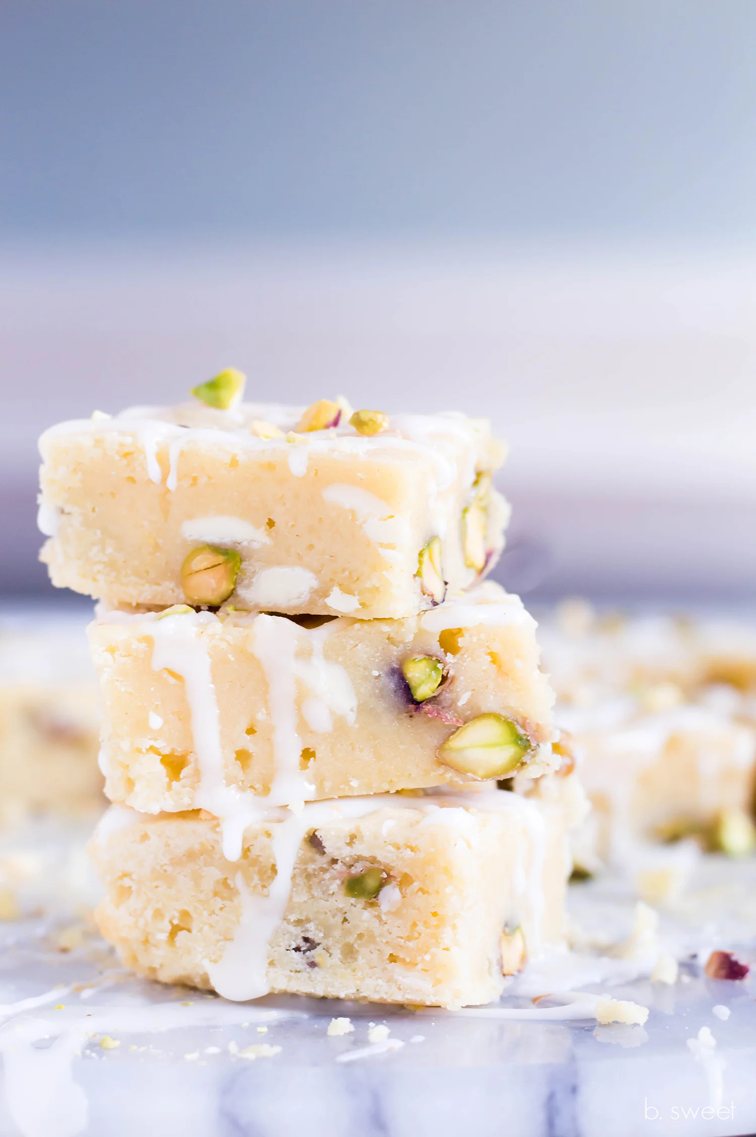 I am all for fudgy chocolate brownies but sometimes you need something a bit lighter, buttery and citrusy. These Lemon Pistachio Blondies are just that. Don't skimp on the lemon glaze! It's brightness pulls everything together. Lemon zest and juice adds the perfect pucker to balance out the sweetness of the white chocolate. If pistachios aren't your thing you can replace them with almonds or just add more white chocolate chips/chunks to the batter. I haven't tried it yet but I think these would be delicious with some dried cranberries or even fresh summer blueberries.