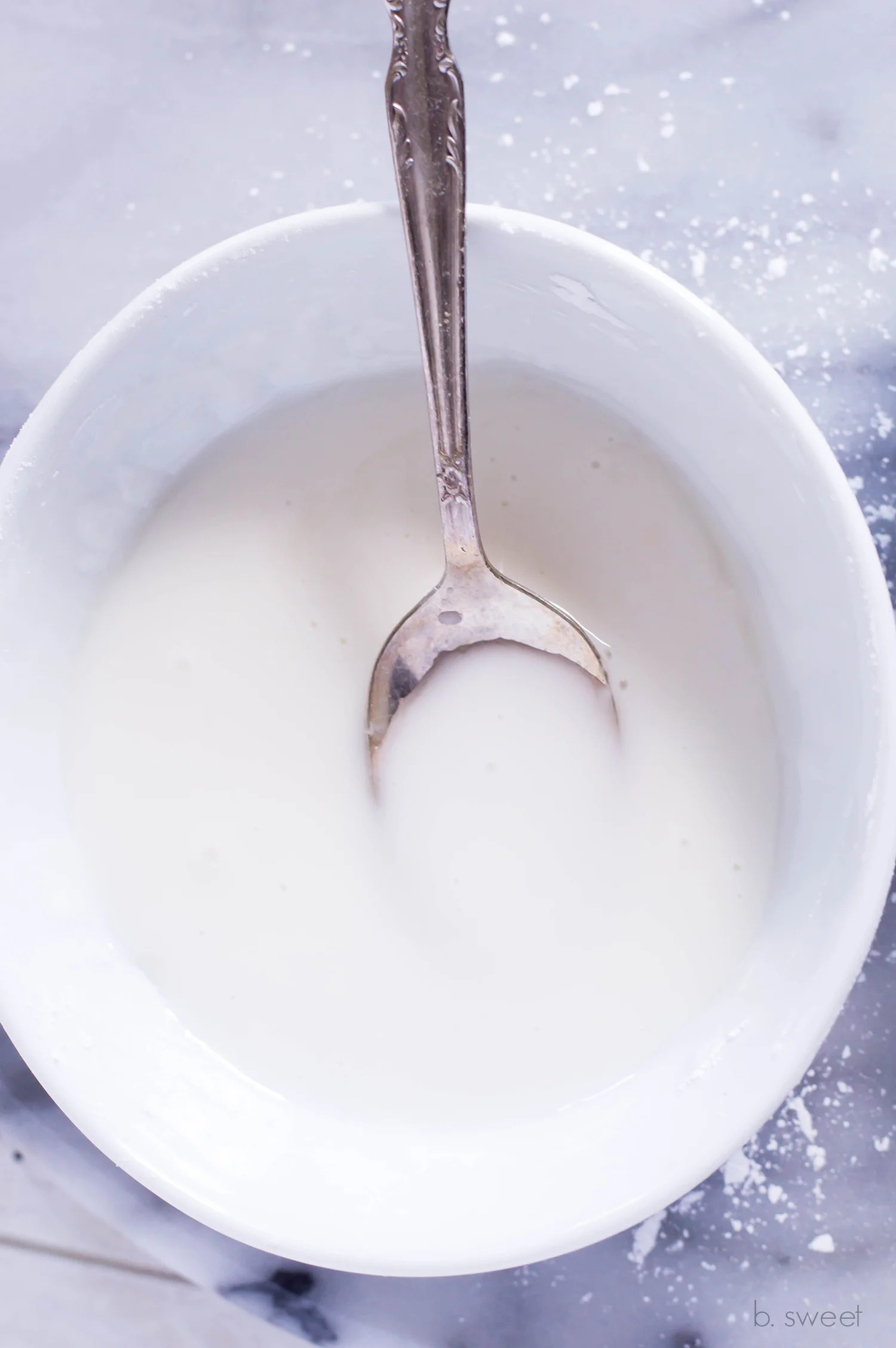 Add the batter to your prepared pan and bake for 25 minutes until just set. Remove from the oven and let cool completely before adding glaze (recipe below) and cutting.