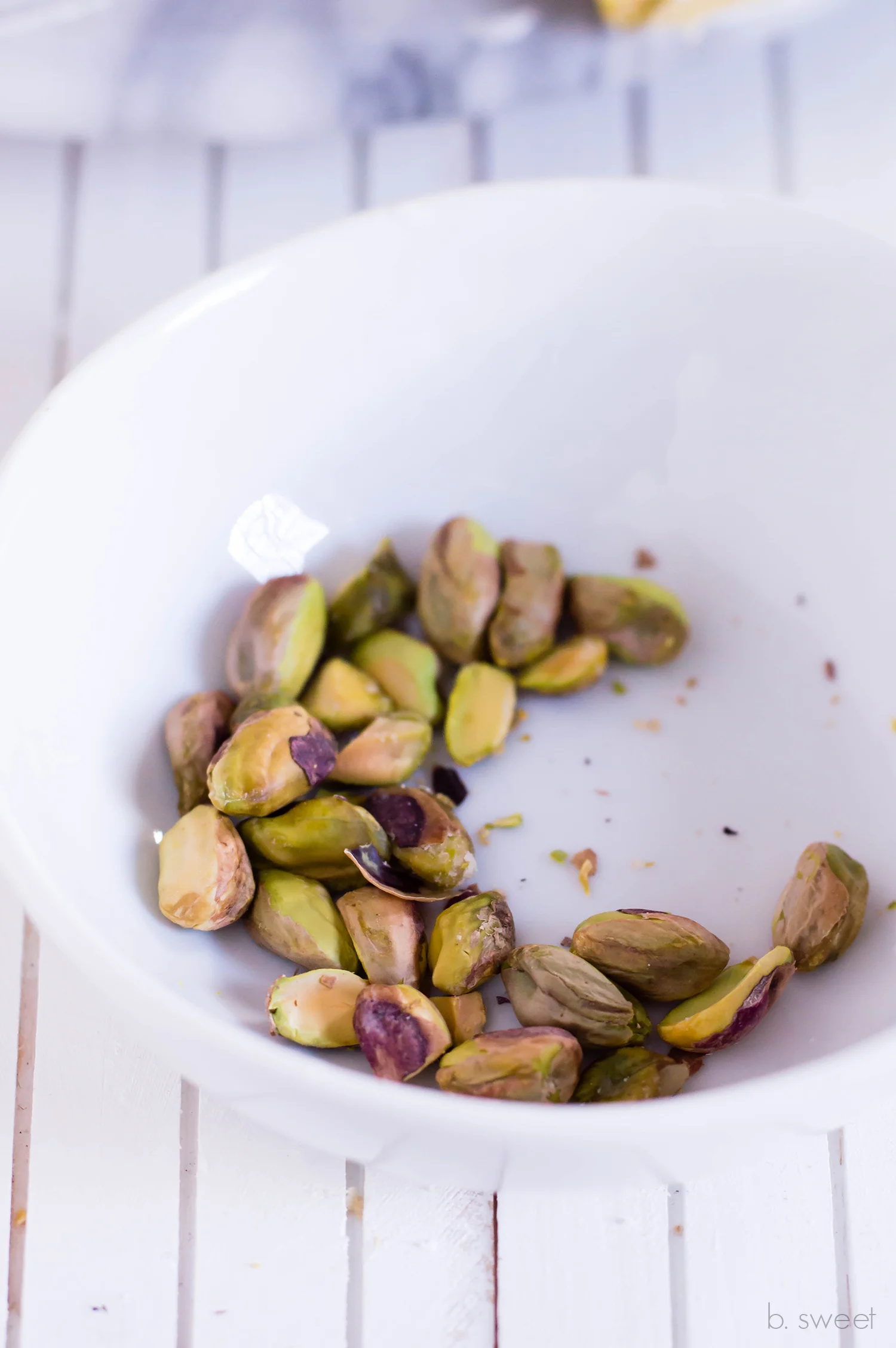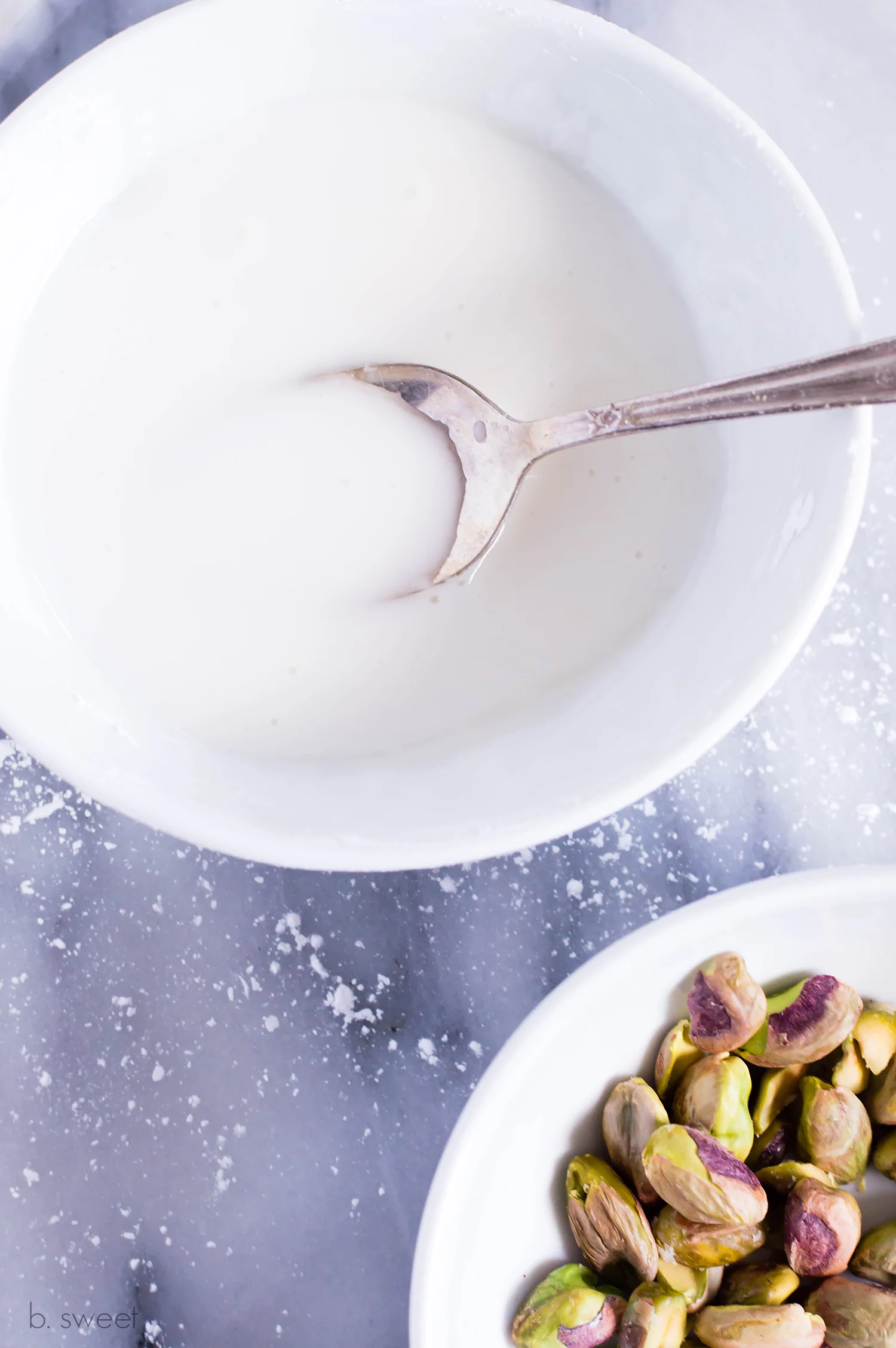 In a separate bowl whisk together salt, flour, white chocolate chips/chunks, and pistachios.